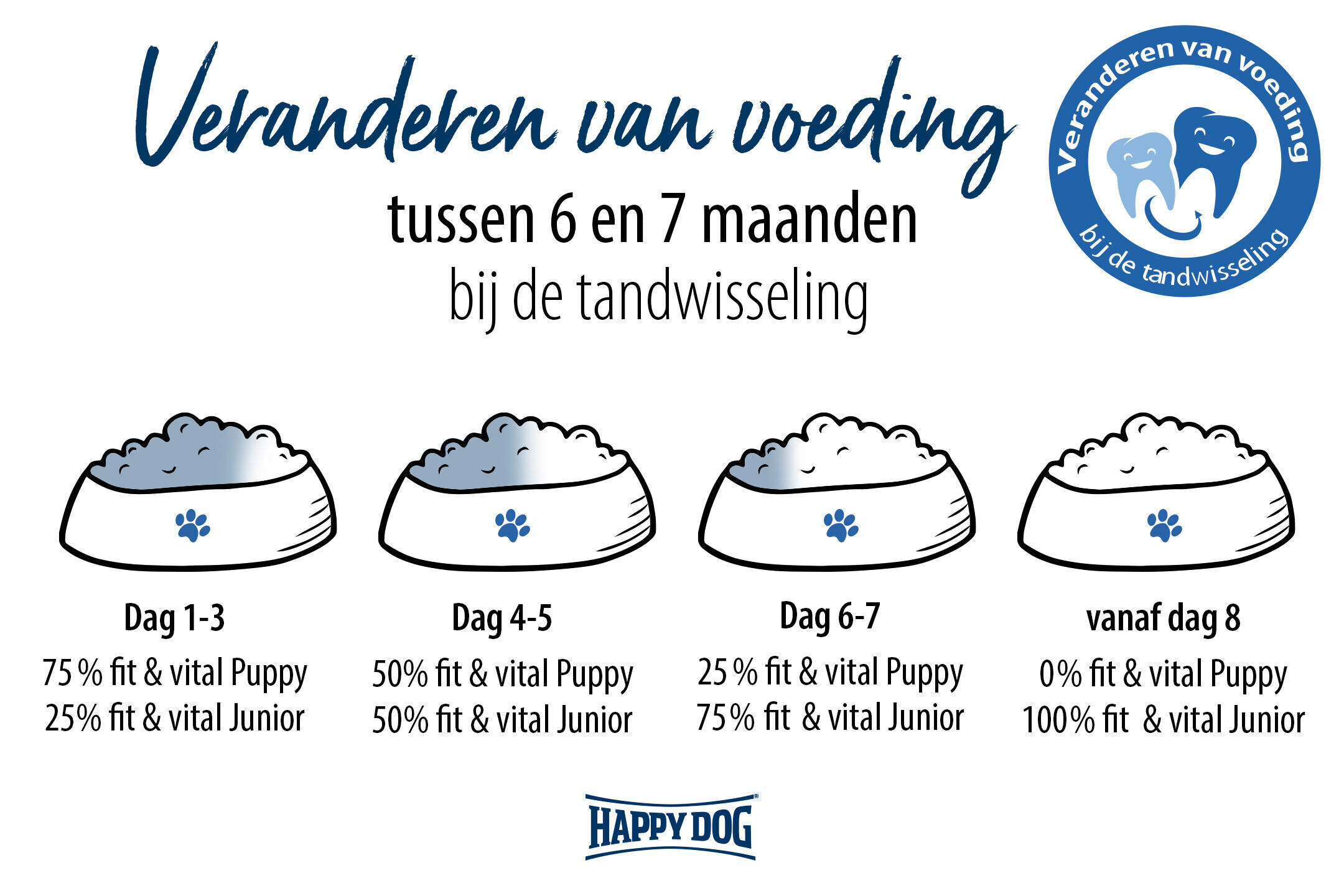 Uw viervoeter groeit erg hard tot hij ongeveer 6 maanden oud is. Daarna begint de jonge hondfase met een gematigde groei. Dat is ook het moment waarop u overschakelt op een hondenvoeding die bij deze fase past, zoals bijvoorbeeld onze fit & vital Junior. Laat uw hond langzaam aan de nieuwe voeding wennen door het meerdere dagen telkens in een groter aandeel door zijn huidige voeding te mengen. Zo kan het spijsverteringsstelsel van uw hond zich aanpassen aan de andere voeding.