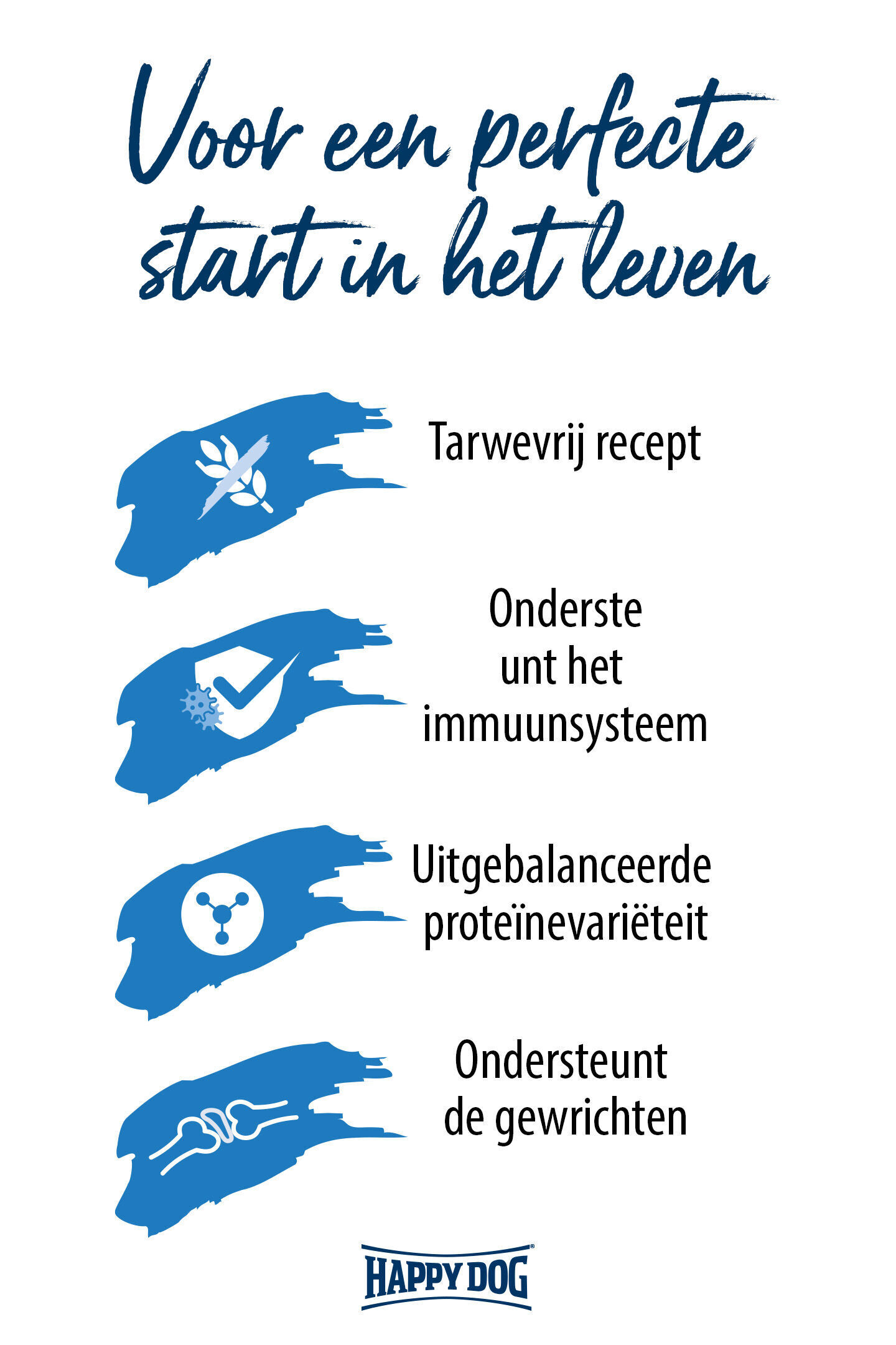In de belangrijke eerste levensfase van de eerste tot de zesde maand groeit je puppy enorm hard. Des te meer voedingsstoffen hij ook nodig heeft om zich gezond te ontwikkelen. Met de evenwichtige puppyvoeding fit & vital Puppy van Happy Dog ondersteunt u een gezonde groei van je nieuwe familielid. De lekkere totaalvoeding bevat proteรฏnen van 5 geselecteerde dierlijke producten. De voeding levert je puppy bovendien tal van natuurlijke voedingsstoffen: lijnzaad bevat Omega 3- en Omega 6-vetzuren, die een glanzende vacht en een gezonde huid bevorderen. De gember in de voeding versterkt het immuunsysteem en is net als het vlees van de Nieuw-Zeelandse mossel goed voor de gewrichten van uw puppy. Optimaal dus voor de belangrijkste groeifase.