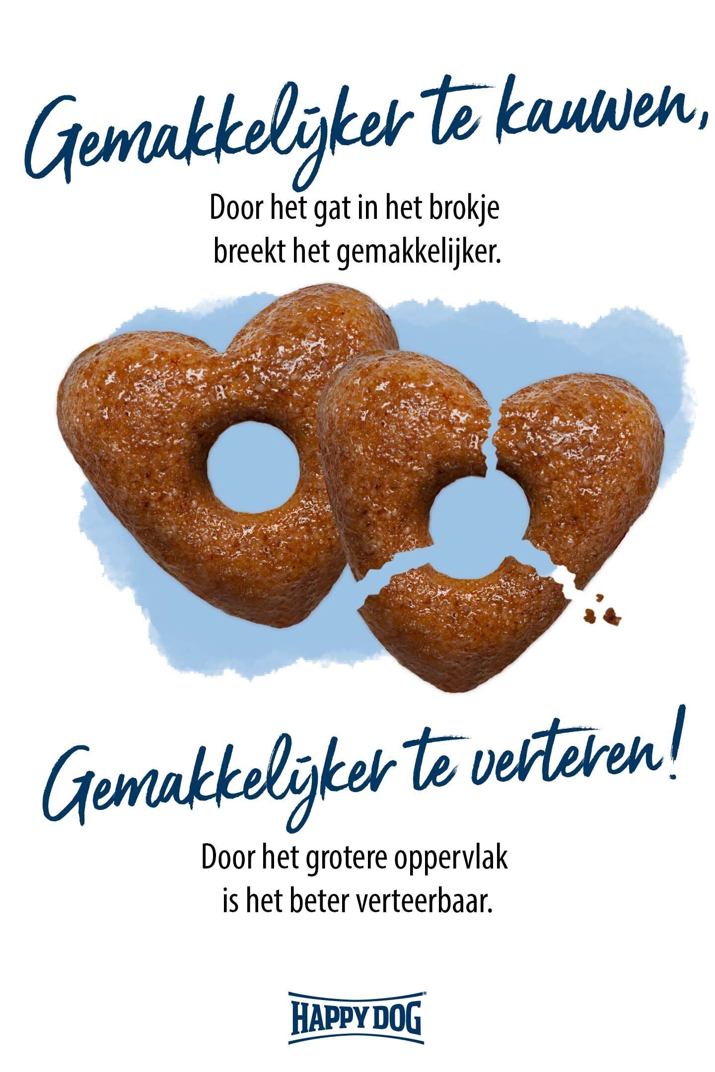 De brokjes voor de puppyvoeding zijn hartvormig en hebben een gat in het midden. Zo kan uw puppy bij het eten de stukjes gemakkelijker in stukken bijten en beter kauwen. Door het grotere oppervlak wordt de voeding optimaal opgelost door de maagsappen. Dat bevordert de vertering.
