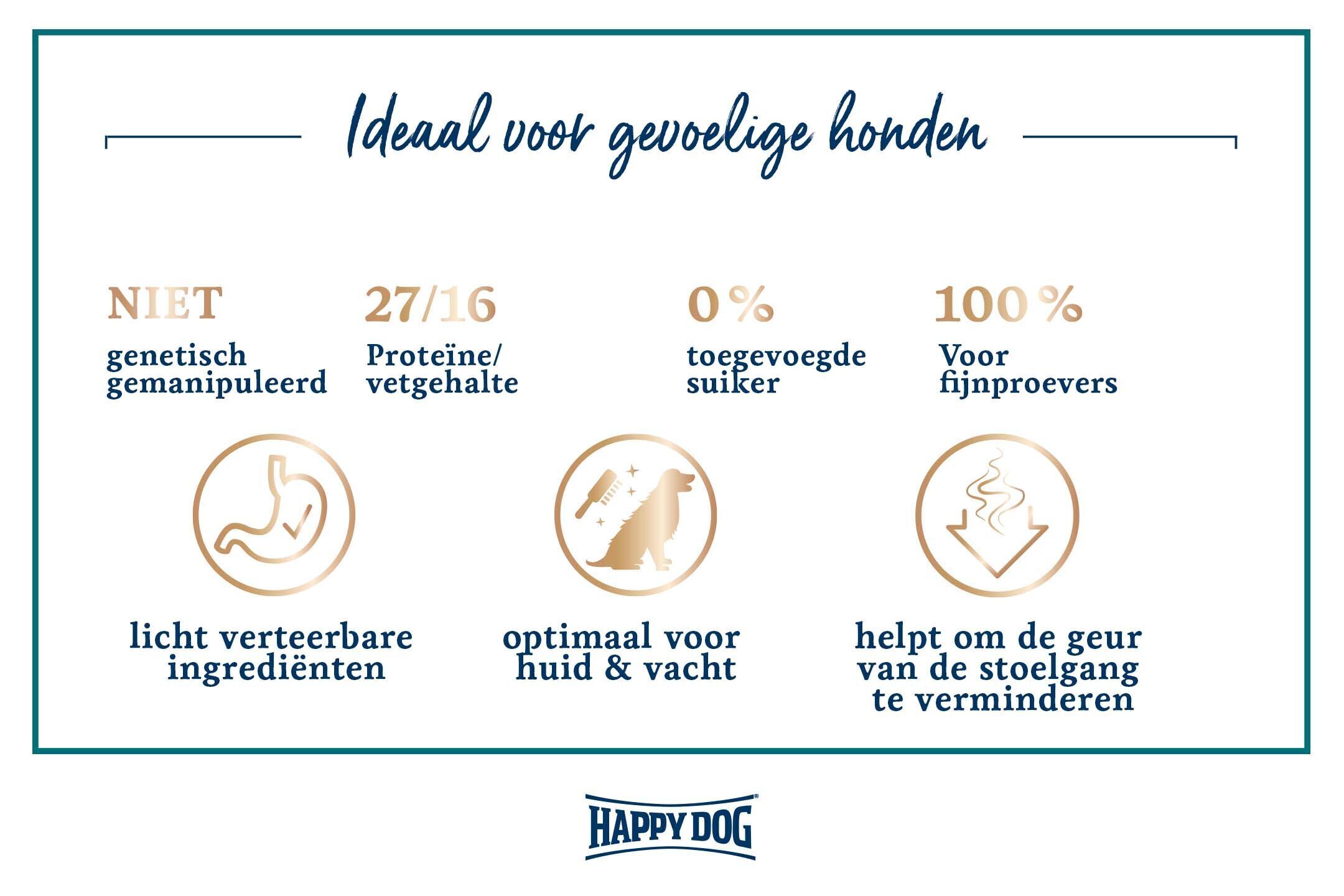 kippenvlees* (27 %), rijst, rijstmeel, rijstproteïne, gevogelte, suikerbietensnippers* (ontsuikerd), lijnzaad, zonnebloemolie, appelpulp* (1,3 %), leverhydrolisaat, cellulose, vishydrolisaat*, kaliumchloride, raapzaadolie, maïs, gist*, natriumchloride, zeealgen* , cichoreipoeder (0,15 % = 0,1 % inuline), gist* (geëxtraheerd 0,2 % = 0,016 % mannan-oligosacchariden)), yucca schidigera* (0,1 %), mosselvlees*, kurkuma (0,05 %), mariadistel, artisjok, paardenbloem, gember, berkenbladeren, brandnetel, kamille, koriander, rozemarijn, salie, zoethoutwortel, tijm, (totaal gedroogde kruiden: 0,16 %);