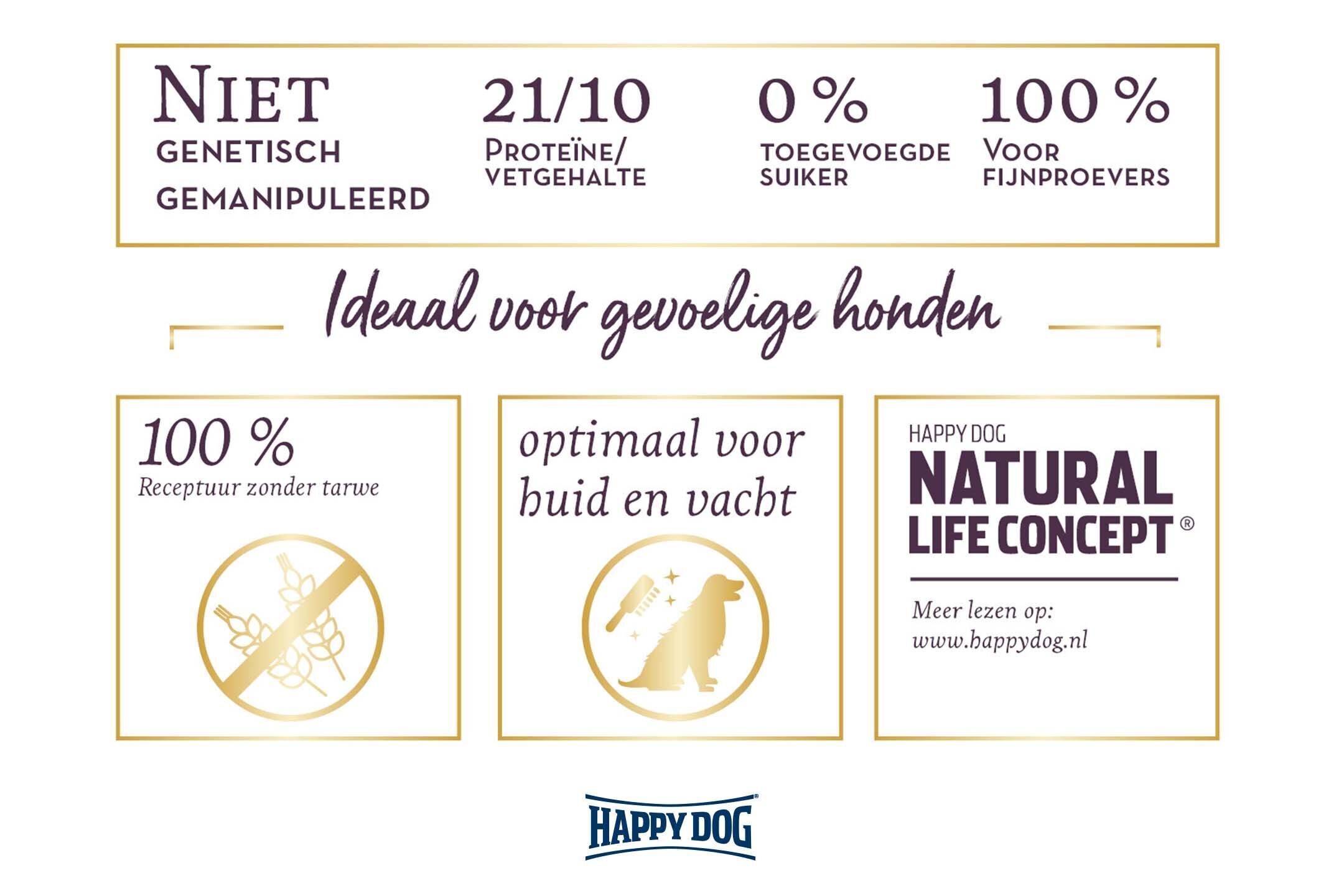 Is uw hond kieskeurig en wilt u hem enkel de beste voeding geven? Verwen uw fijnproever dan met een uitgelezen samenstelling van voedzame zalm, lekker konijn en waardevolle granen. Zalm is rijk aan essentiรซle omega-3 en omega-6 vetzuren, terwijl konijn biologisch waardevol eiwit en andere belangrijke voedingsstoffen levert. Volkoren graan zit boordevol belangrijke voedingsvezels voor een geregelde spijsvertering. Geheel volgens het unieke Happy Dog Natural Life Conceptยฎ ondersteunt Nieuw-Zeelandse mossel de gewrichten en zorgen waardevolle omega-3 en omega-6 vetzuren voor een glanzende vacht en een intacte huid.