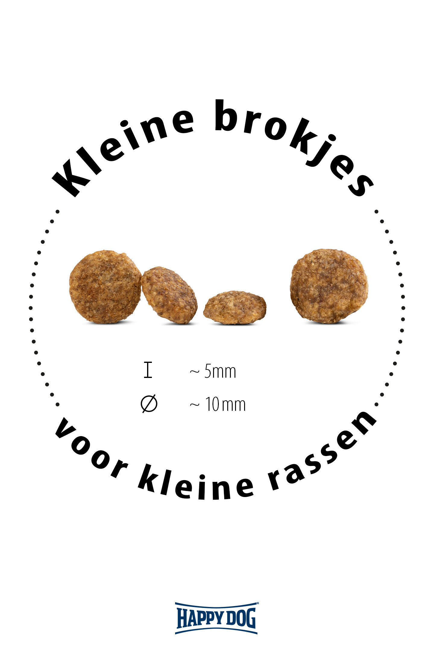 De kleine brokjes zijn door hun formaat optimaal aangepast aan het gebit van kleine honden tot 10 kg. Bovendien bevat de voeding uit ons Happy Dog Sensible Mini assortiment geen kunstmatige kleur- en geurstoffen, conserveringsmiddelen of toegevoegde suiker. Wij gebruiken uitsluitend natuurlijke ingrediënten die niet genetische gemanipuleerd werden. Geen compromissen dus voor je kleine hond, maar 100 % smaak!