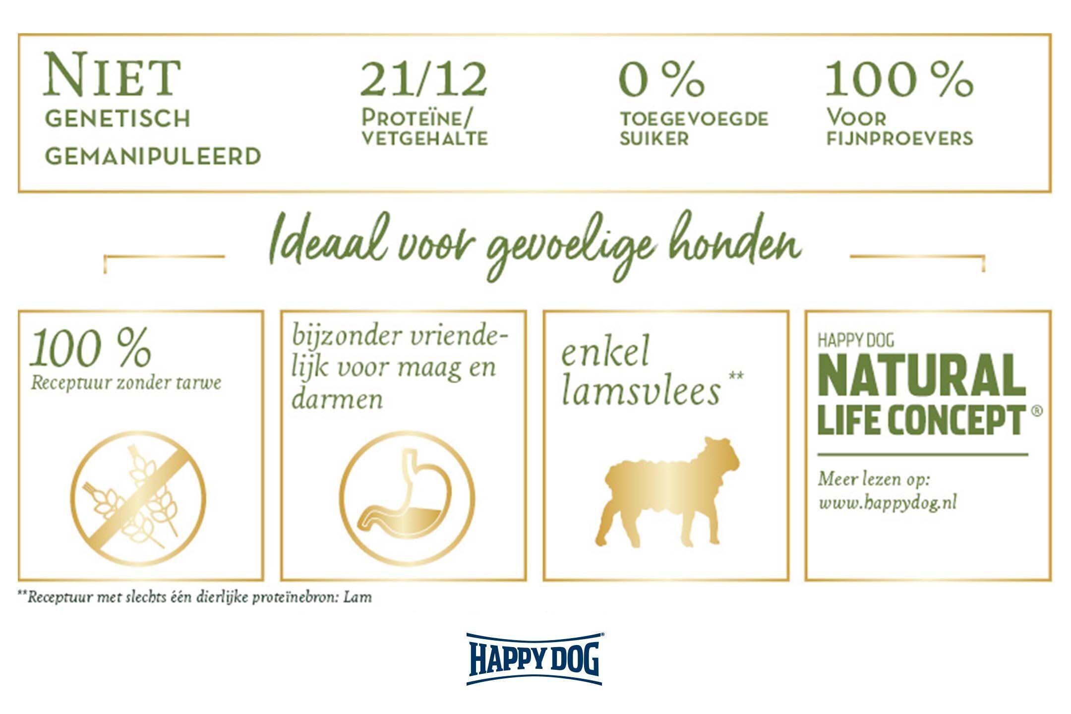 Gun uw viervoetige kameraad een heerlijke smaaksensatie met deze lekkere samenstelling van Happy Dog Neuseeland. Een echte lekkernij die dankzij licht verteerbaar lamsvlees en een glutenvrije receptuur bijzonder vriendelijk is voor maag en darmen. Zorgvuldig geselecteerde, natuurlijke ingrediรซnten maken het product onweerstaanbaar lekker en goed verdraagbaar voor uw lieveling. Geheel volgens het unieke Happy Dog Natural Life Conceptยฎ ondersteunt Nieuw-Zeelandse mossel de gewrichten en zorgen waardevolle omega-3 en omega-6 vetzuren voor een glanzende vacht.