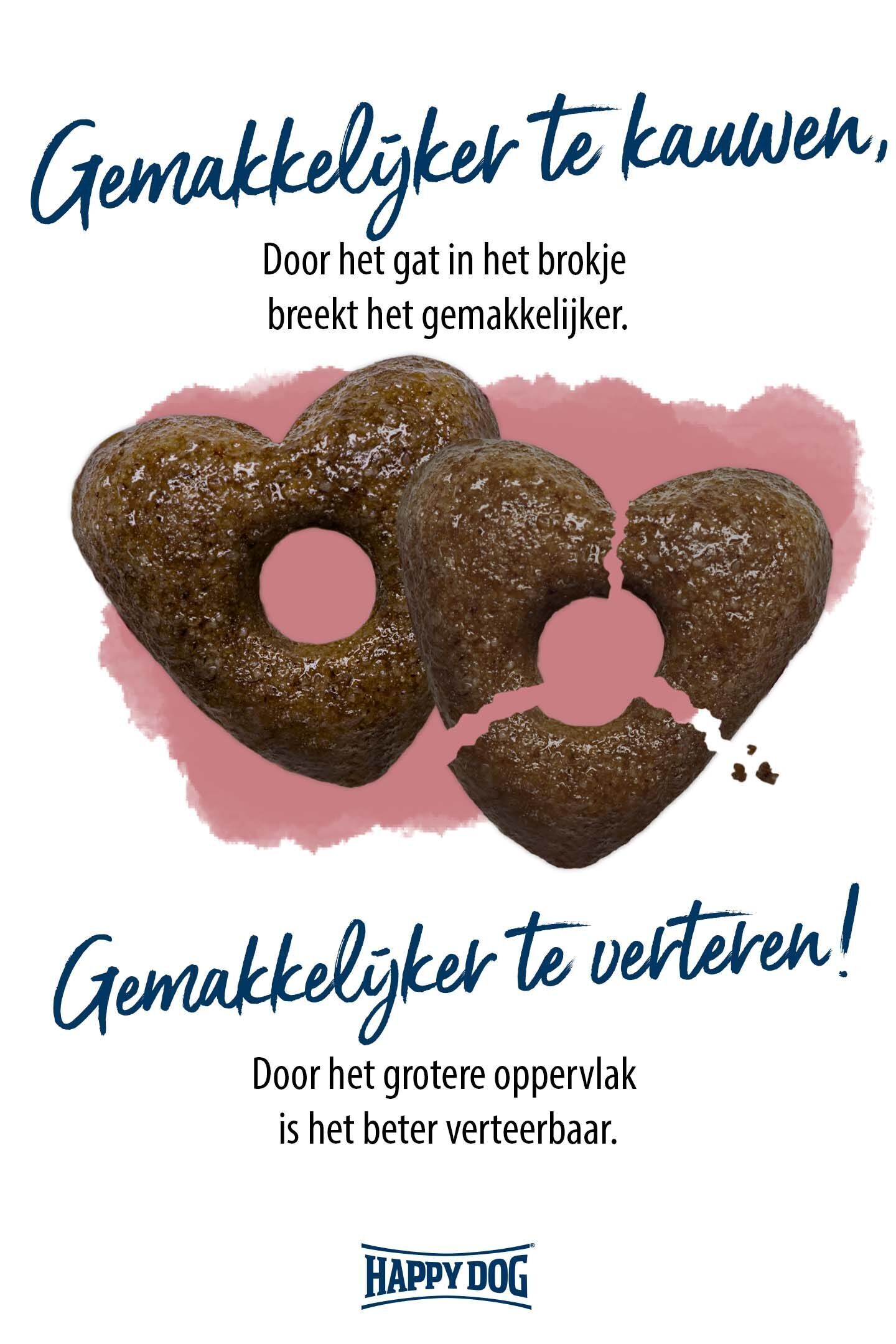 Het gat biedt meteen twee voordelen: het brokje breekt zo sneller en is gemakkelijker te kauwen. Daarnaast hebben de brokjes op die manier een groter oppervlak en kunnen ze in de maag en de darmen beter worden opgelost en verteerd. Dat ondersteunt allebei een goede en gezonde vertering.