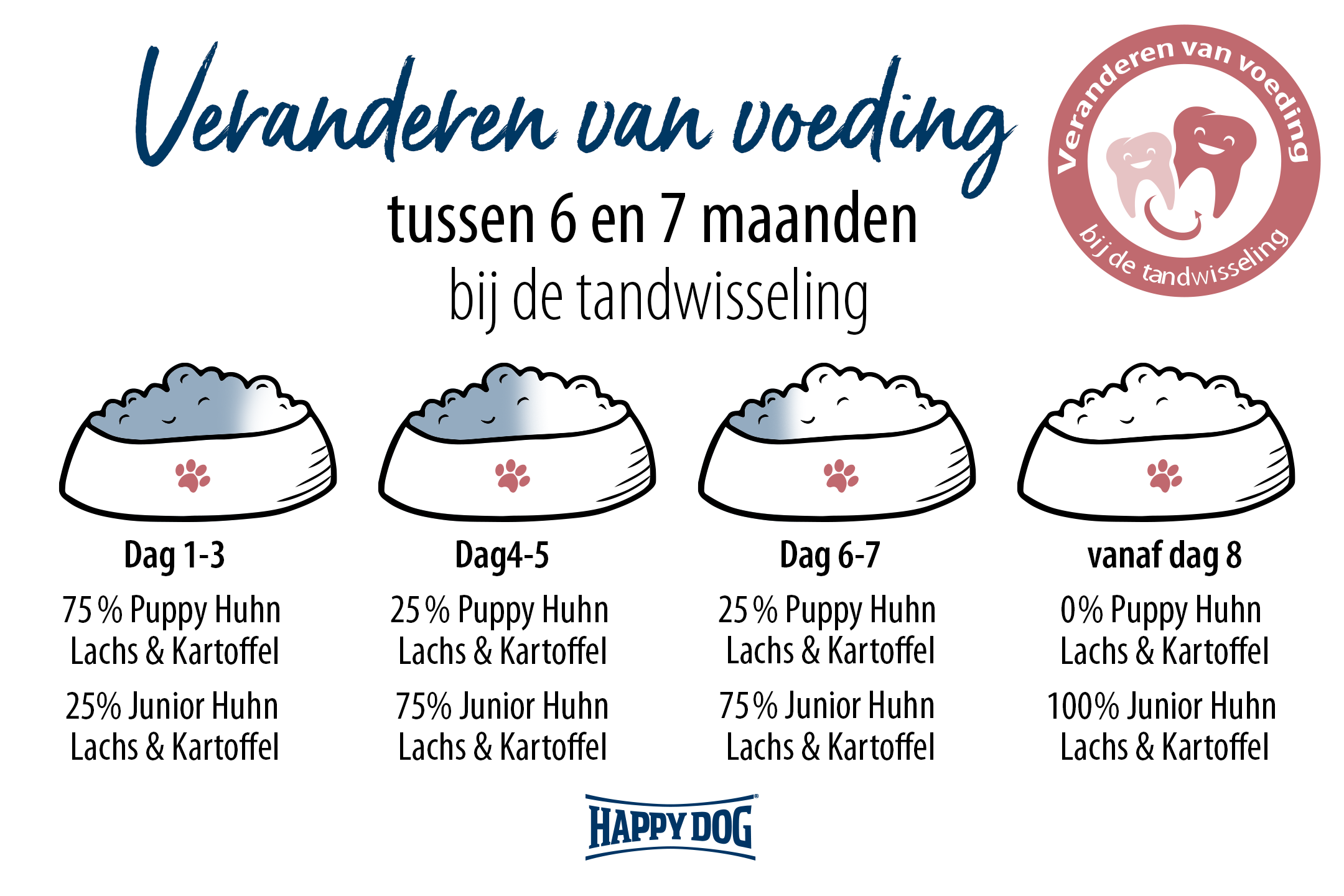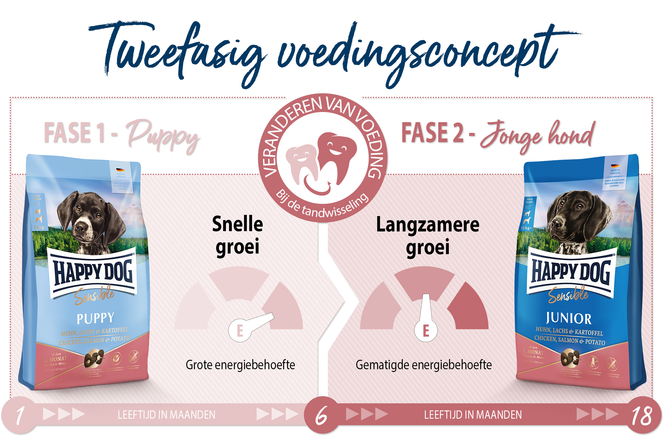 Happy Dog Sensible Puppy Huhn, Lachs & Kartoffel (Kip, Zalm & Aardappel) is als totaalvoeding geschikt voor puppyโs vanaf 4 tot 27 weken. Daarna moet u in kleine stapjes overschakelen op een geschikte voeding voor jonge honden โ bijvoorbeeld Happy Dog Sensible Junior Huhn, Lachs & Kartoffel.