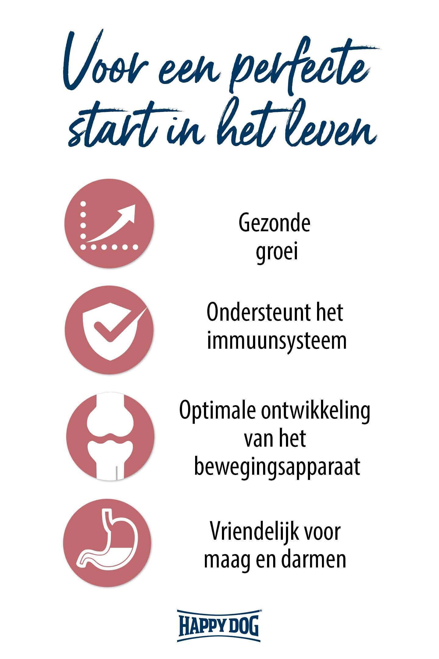 Als puppy heeft uw trouwe viervoeter een voedzame voeding nodig, die hem in de eerste maanden optimaal ondersteunt. Van de 1e tot ongeveer de 6e maand zit uw kleine lieveling immers in zijn belangrijkste groeifase. Daarom is de hondenvoeding van Happy Dog in deze intensieve groeifase bijzonder voedzaam en rijk.