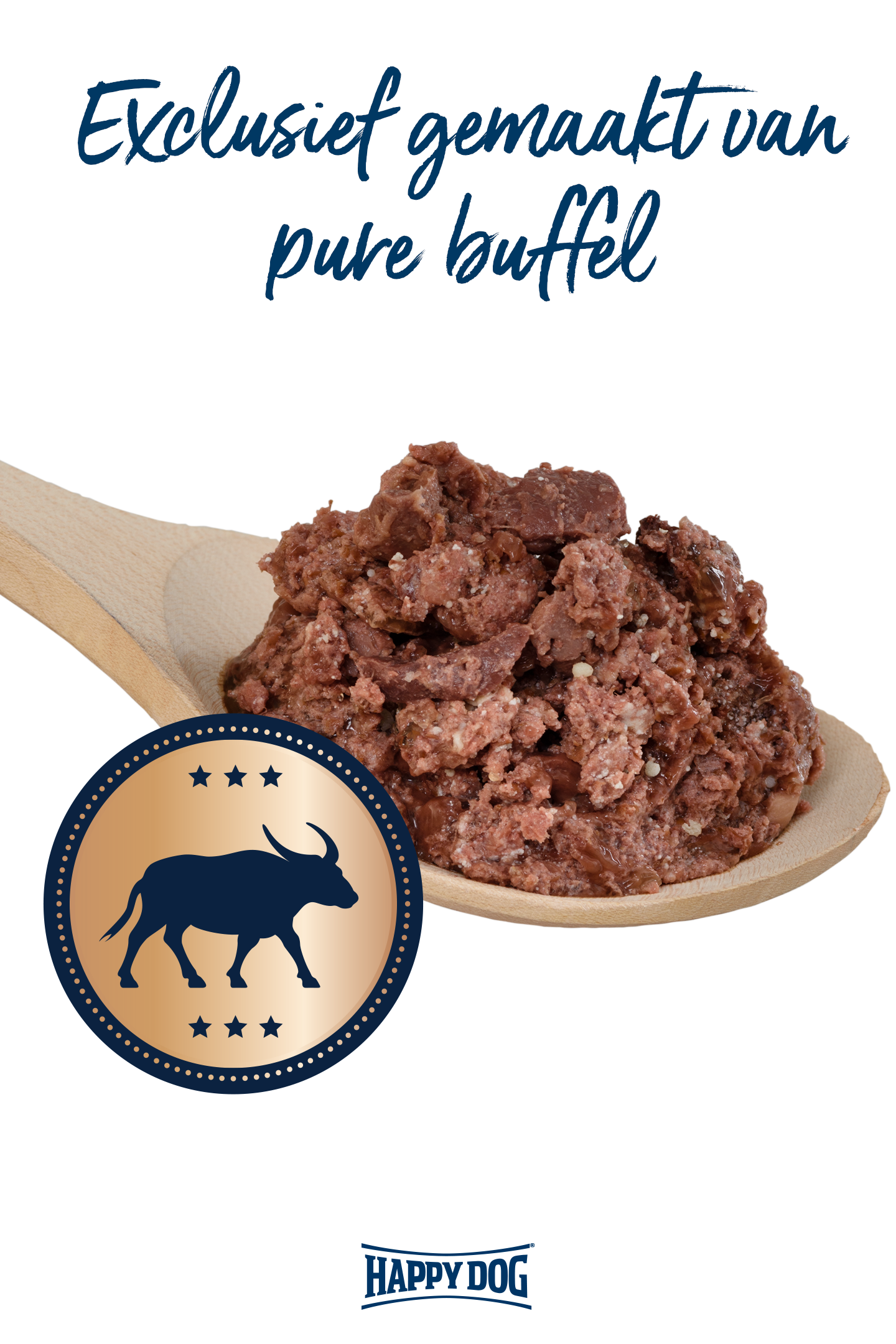 Met Happy Dog Buffel Pur premium natvoer voor honden ligt er een stukje natuur in het voerbakje! Onze hoogwaardige vleesvoeding van zeer hoge kwaliteit wordt voor 100 % gemaakt van waardevol vlees, organen zoals hart, long en lever en bevat levensnoodzakelijke vitamines en mineralen. Het vlees en de organen zijn daarbij uitsluitend afkomstig van buffel*. Het natvoer wordt gemaakt zonder soja of andere plantaardige ingrediënten.