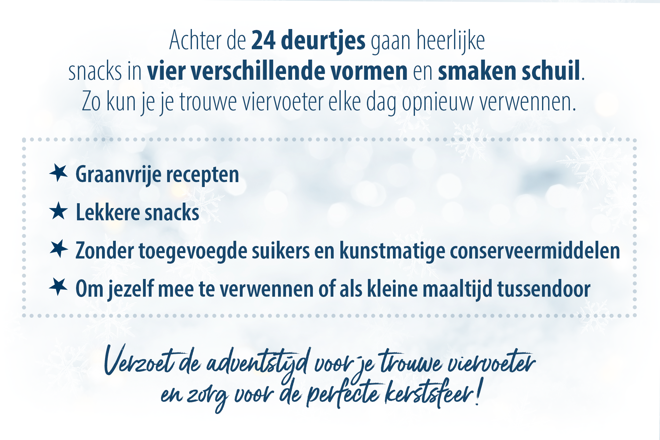 Maak van Kerstmis een tijd van vreugde voor je trouwe viervoeter met de snack-adventskalender van Happy Dog. Maak van elke dag een feest van lekkernijen en bezorg je viervoeter onvergetelijke momenten van genot!