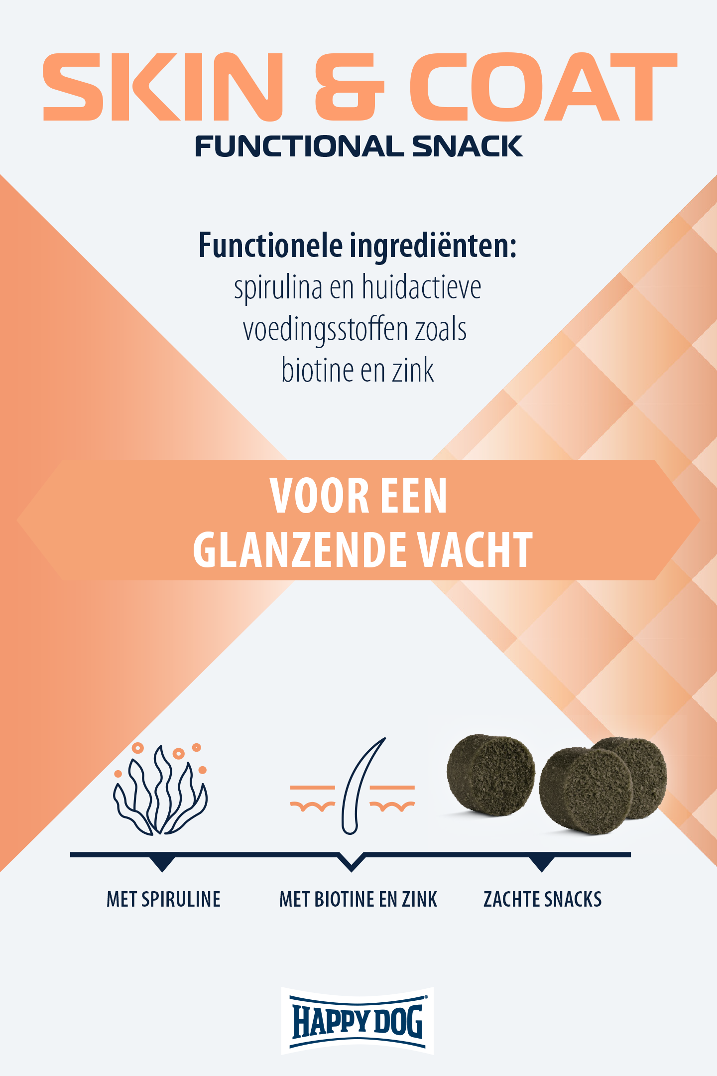 Een zijdezachte glanzende vacht - welke hondeneigenaar droomt daar niet van? De graanvrije hondensnacks zijn verrijkt met de huidactieve voedingsstoffen biotine en zink, voedzame spirulina en algenolie, die essentiële vetzuren bevat en ondersteunen de natuurlijke huidfunctie en een glanzende vacht. De zachte functionele hondensnack zijn gemakkelijk in gebruik en perfect te doseren. Onze lekkernijen voor honden worden geproduceerd zonder toegevoegde suikers en zonder kunstmatige geur- en kleurstoffen of conserveringsmiddelen.