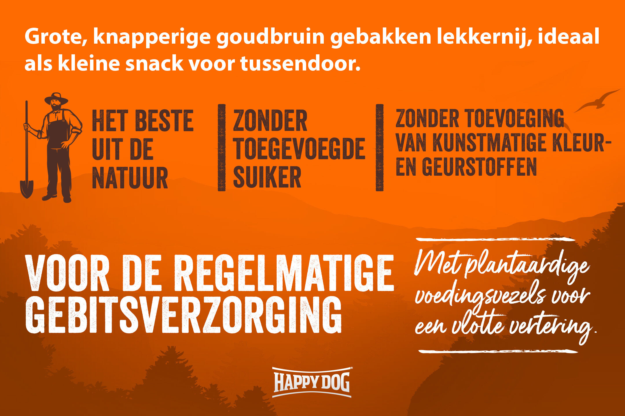 Heb je zin en tijd om hondenkoekjes te bakken? Op het internet vind je tal van lekkere recepten voor zelfgemaakte hondenkoekjes. Voor iedereen die de tijd niet heeft of het niet ziet zitten om zelf hondenkoekjes te bakken, zijn er de goudbruin gebakken hondenkoekjes van Happy Dog. Onze NaturCroq hondenkoekjes zijn een uitstekende manier om middelgrote en grote honden op een zinvolle manier bezig te houden. Deze speciale lekkernij van granen, waardevolle proteïnen en mineralen is krokant gebakken en kan door zijn grootte en consistentie niet in één hap door je viervoeter worden opgegeten. Met de lekkere hondensnacks zal je hond lang zoet zijn met knagen en kauwen. Dit helpt onder andere om verveling tegen te gaan of dient als afleiding of bezigheid als je hond bijvoorbeeld ergens moet wachten of alleen moet blijven.