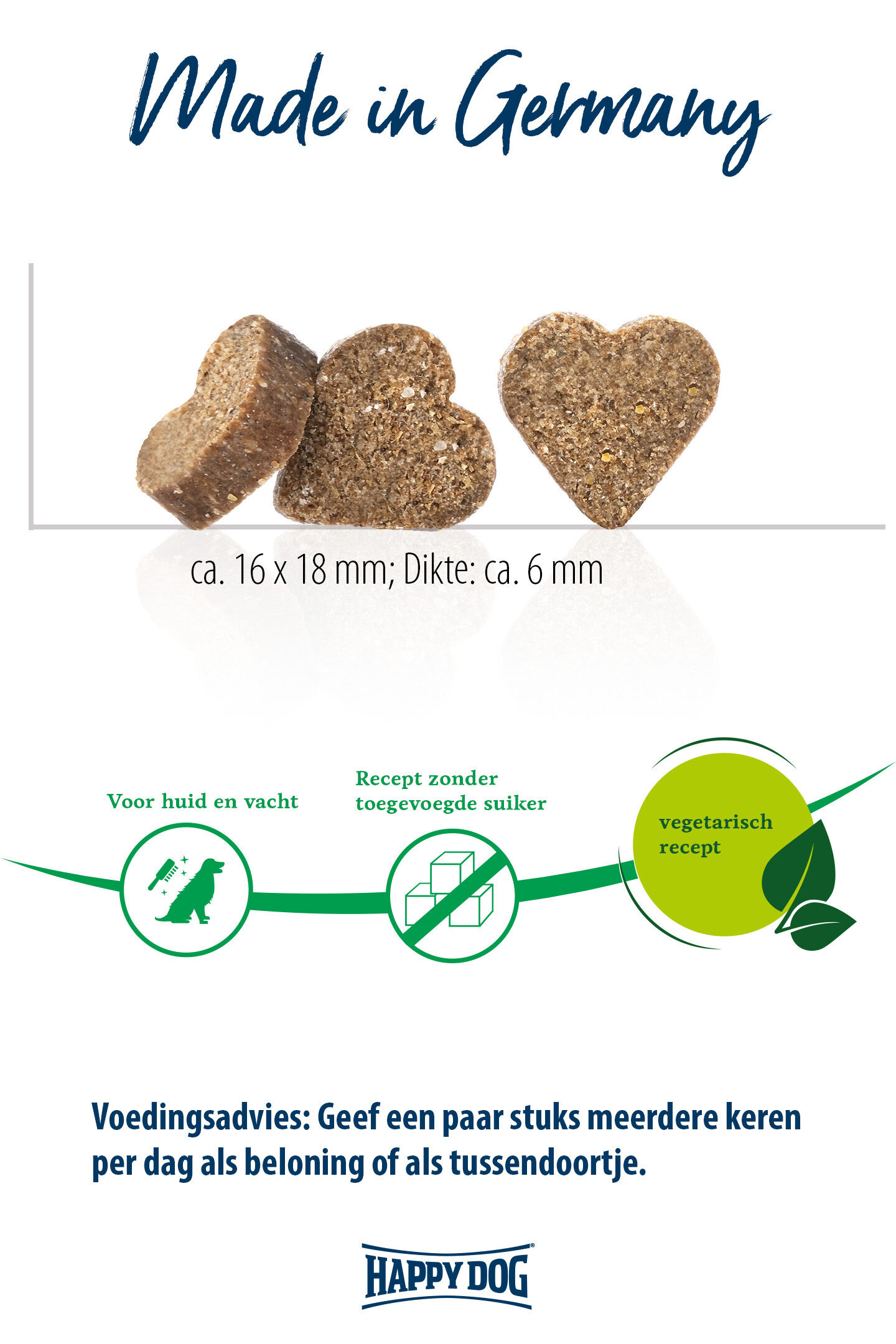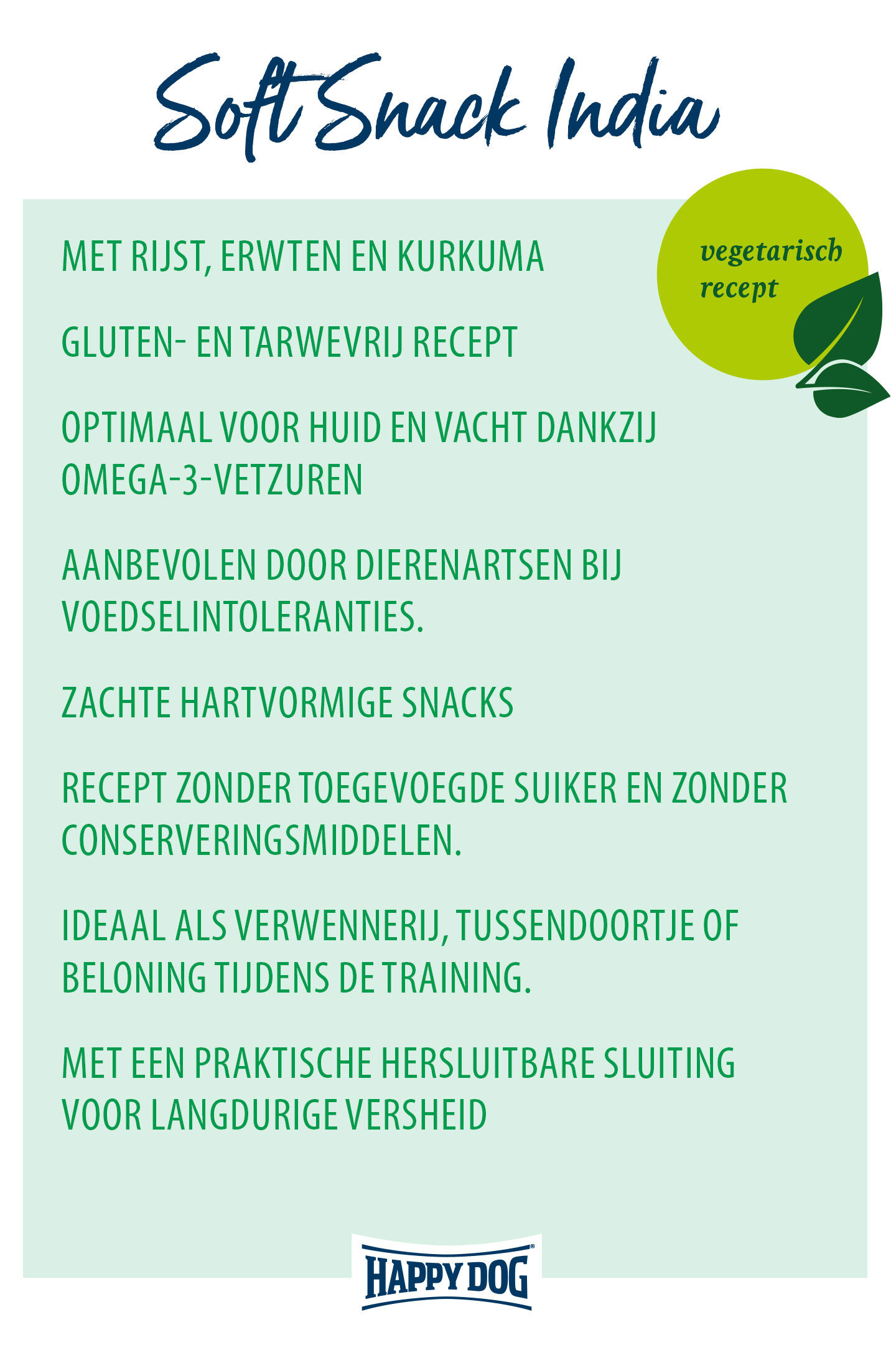 De hartvormige zachte snack Happy Dog India is ideaal om je lieveling te verwennen of als kleine maaltijd tussendoor. De combinatie van goed verteerbare rijst en erwten met de waardevolle eigenschappen van cranberries, kokos en kurkuma is een ware smaakbeleving voor veeleisende fijnproevers. De vegetarische snack is ook uitermate geschikt voor gevoelige en veeleisende honden van middelgrote en grote rassen en wordt door dierenartsen aanbevolen bij voedselintoleranties. Uiteraard worden de snacks volgens een recept zonder toevoeging van suiker en conserveermiddelen geproduceerd en hebben ze een hersluitbare verpakking die zorgt voor langdurige versheid. Heerlijke verwenmomenten gegarandeerd!