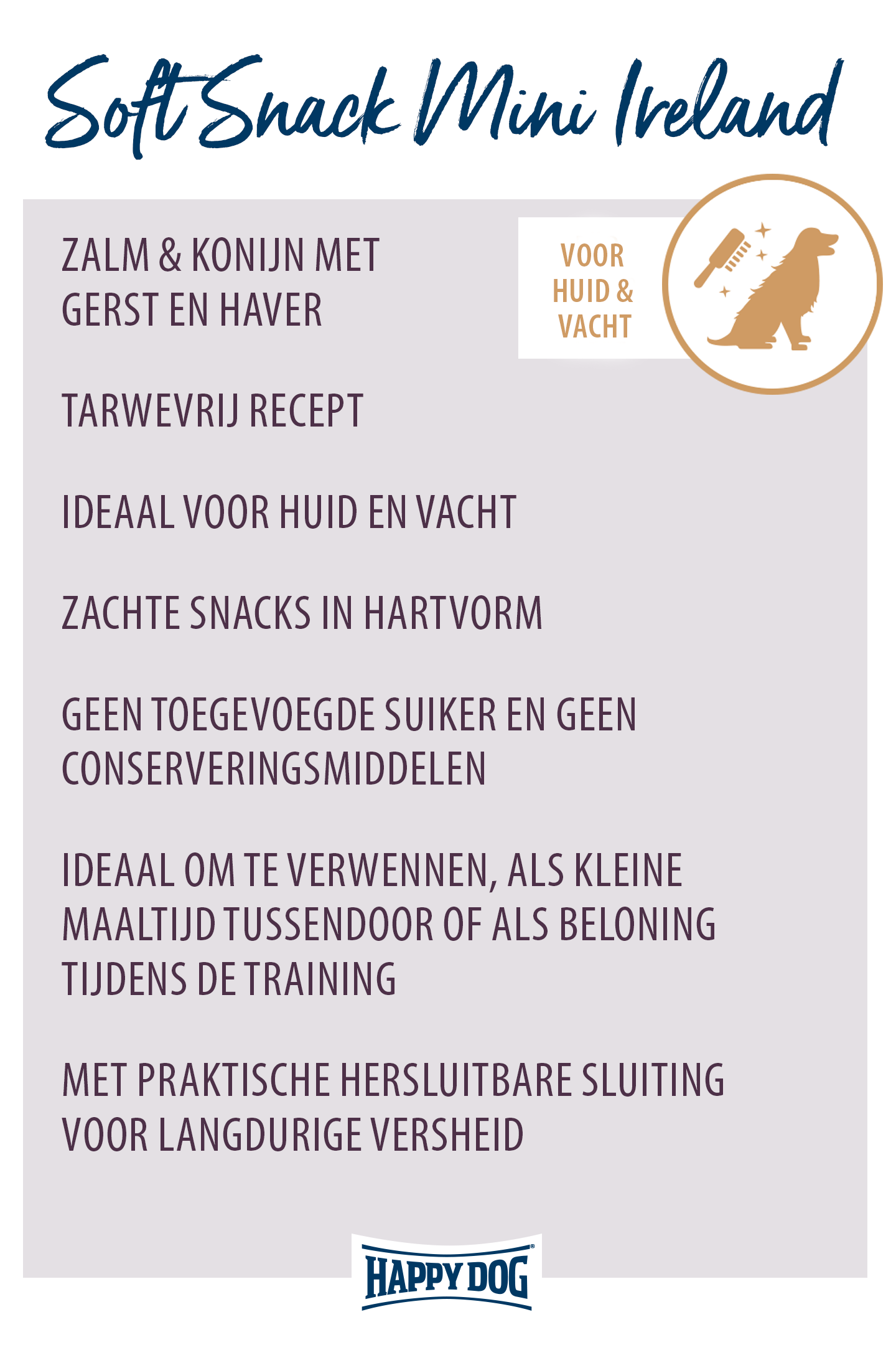 Met een lekkernij in je handen trek je meteen de aandacht van je kleine lieveling. Natuurlijk kun je zelf lekkere snacks voor je viervoeter maken, maar je kunt ook teruggrijpen naar onze smaakvolle Soft Snacks Mini Ireland. Onze lekkere snacks in een handig zakje worden gemaakt van zalm en konijn. We gebruiken principieel geen toegevoegde suikers of kunstmatige conserveringsmiddelen. In de plaats daarvan ondersteunen Omega 3- en Omega 6-vetzuren een glanzende vacht bij je kleine hond. Zo kun je je lieve schat tijdens de training of als tussendoortje een plezier doen.