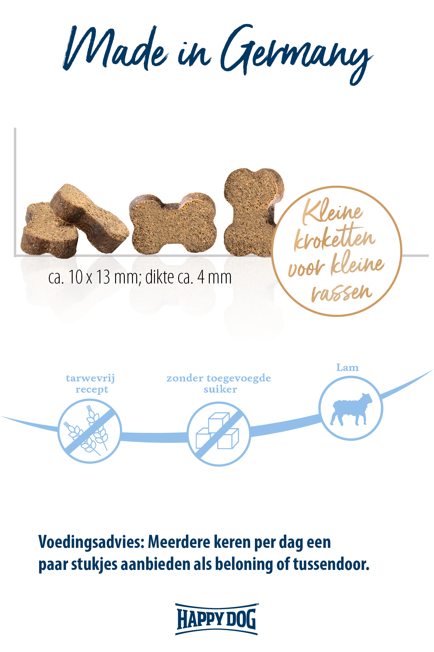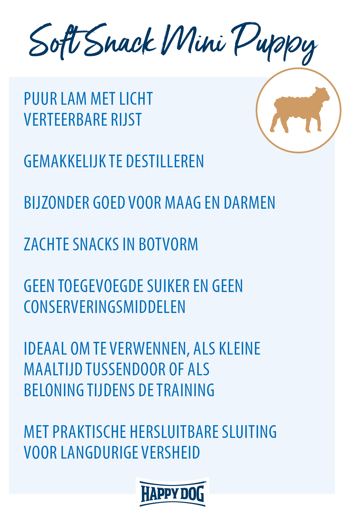 Onze Soft Snack Mini Puppy is trouwens de ideale aanvulling op ons Happy Dog Sensible Mini Puppy droogvoer, onze lekkere voeding voor een gezonde groei van kleine puppyโs.