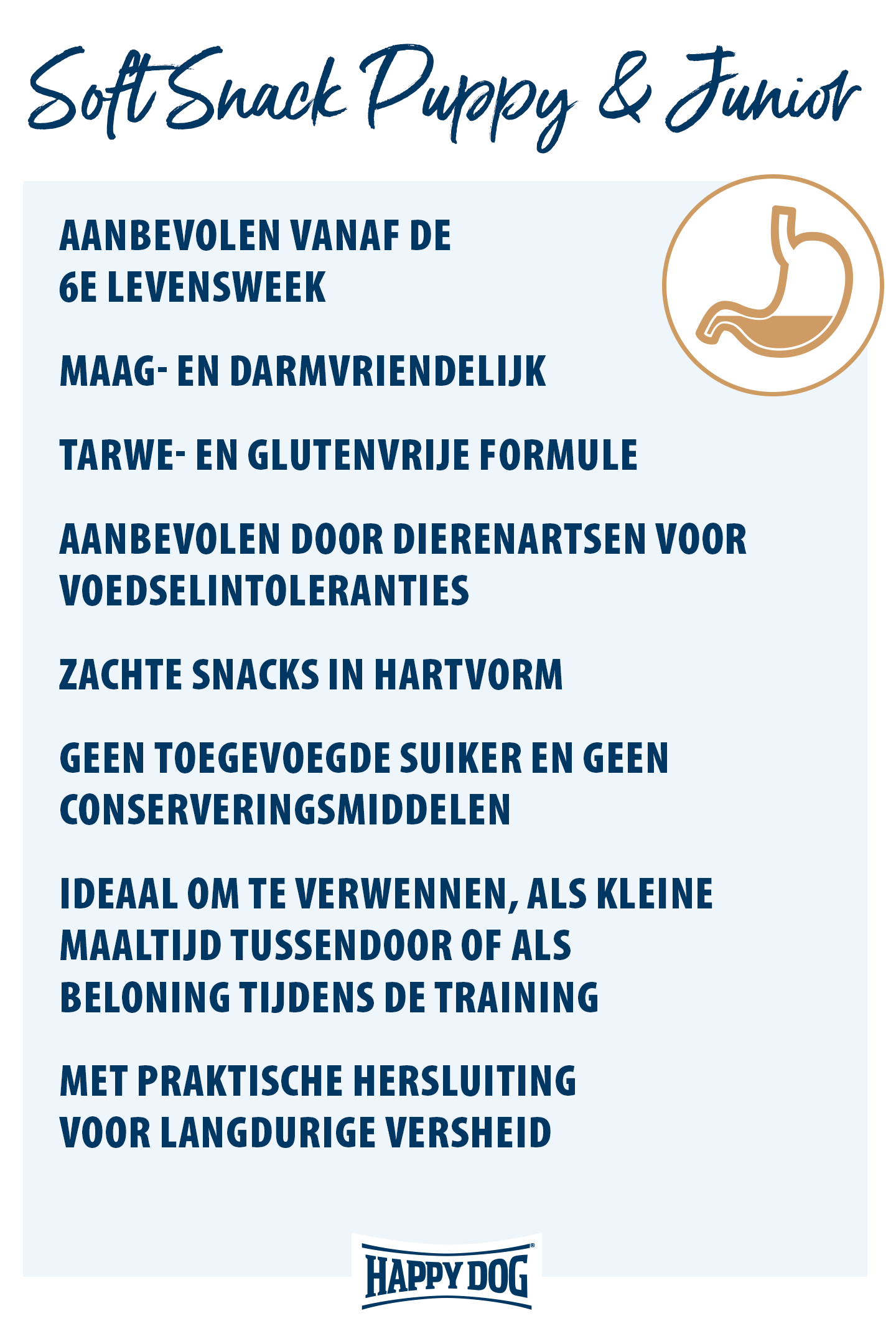 Je zult ongetwijfeld vaak de basiscommando’s oefenen met je kleine lieveling. Om harmonisch onder één dak samen te leven en jullie onderlinge band te versterken, is trainen een echte must. Zeker met labradors of golden retrievers, die van nature erg gulzig zijn, kun je met voeding of snacks snel trainingssuccessen boeken. Wil je bijvoorbeeld met je puppy of jonge hond trainen op terugkomen, dan is het aangeraden om een paar van onze zachte snacks in een snackzakje te stoppen en met hem naar buiten te gaan. Deze lekkere Soft snacks kan geen enkele puppy weerstaan. Je puppy zal met veel enthousiasme al je trainingsopdrachten uitvoeren.